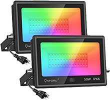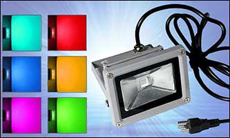 RGB color changeable flood lights bathe the inside or outside of structures in your select color scheme. From 75-WIE indoor drape or wall floods, to 300 WIE landscape flood and 500 W building light projectors, this lighting can provide the special ambiance you are wanting.