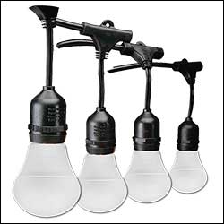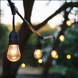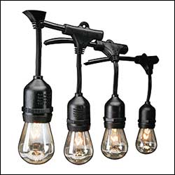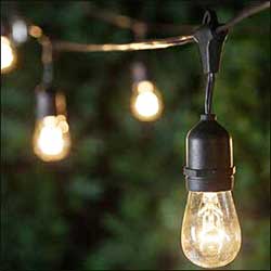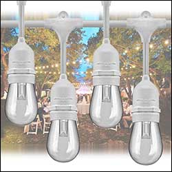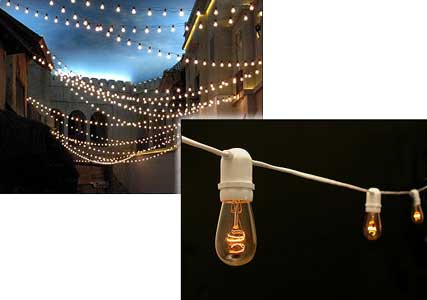 Bistro bulbs are the best suited strands for outdoor runs. Crank up 15 to 20-ft towers are available to raise outdoor installations.