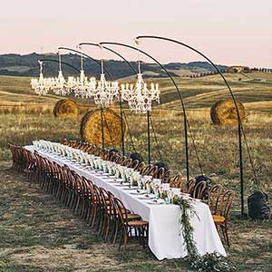 Chandelier hangers make it possible to install chandeliers anywhere, for any event - even completely out in nature! A hidden whisper generator quietly provides all the power needed for the event.