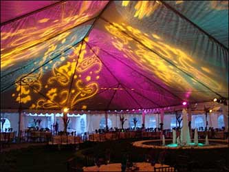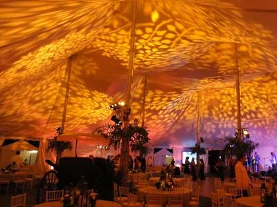 Custom Gobos can be made for your unique monogram or message and standard designs (stars, floral and nature designs or symbols) can be projected for a uniquely warm, beautiful design. Gobos allow the tent top to dissolve away as it becomes a field of beauty. 4+ projector packages are available at a 50% OFFSET discount with a full tent package when you book early so any event can have an incredible projected ceiling.